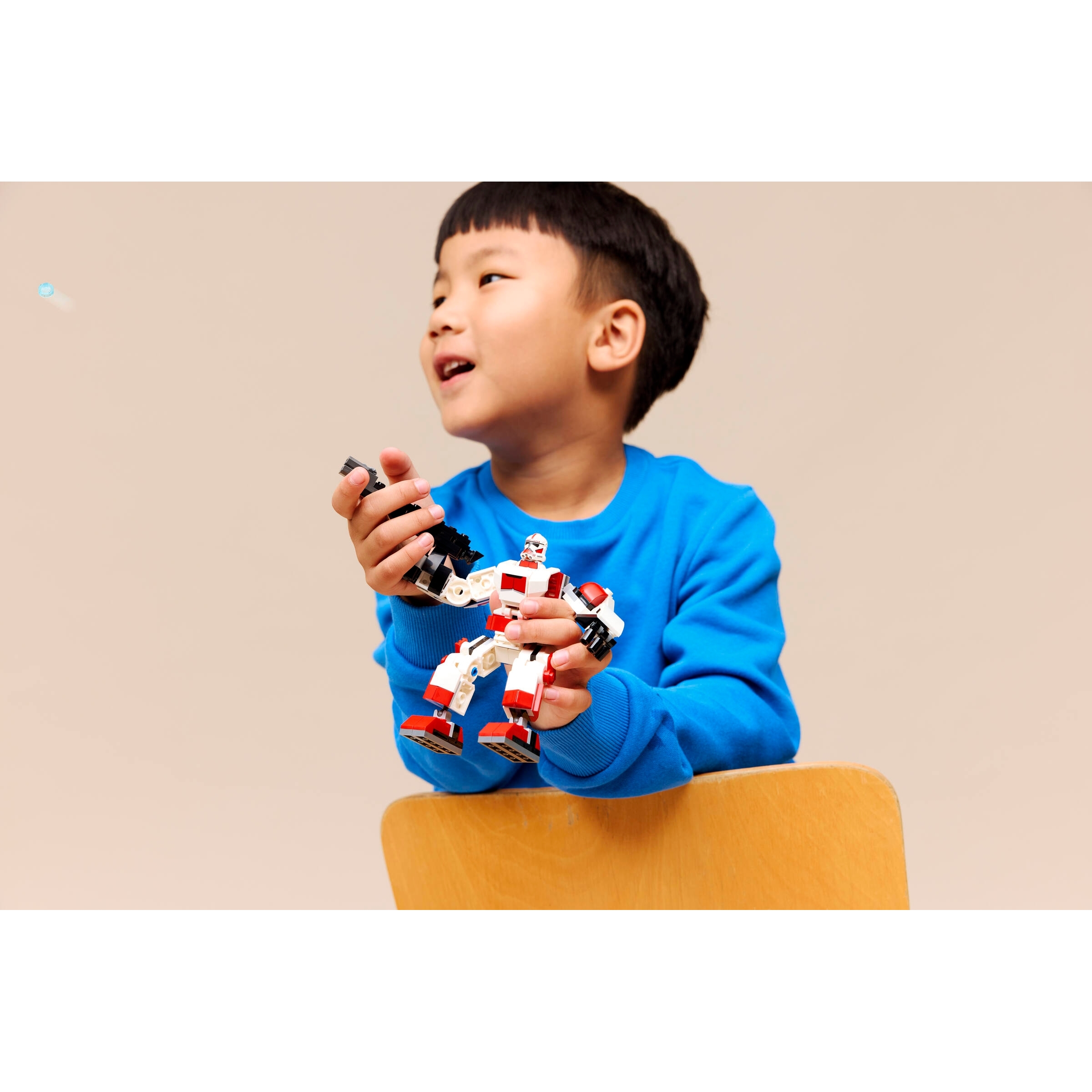 Put the Clone Shock Trooper LEGO minifigure in the mech’s cockpit and clip its blaster rifle to the back of the mech. Adjust the mechs arms, legs and feet to create battle poses. Place the large blaster rifle in its gripping hands and activate its stud shooter. With its armor in the distinctive red and white colors of Clone Shock Troopers, the mech also looks cool displayed in kids’ bedrooms between playtime missions.