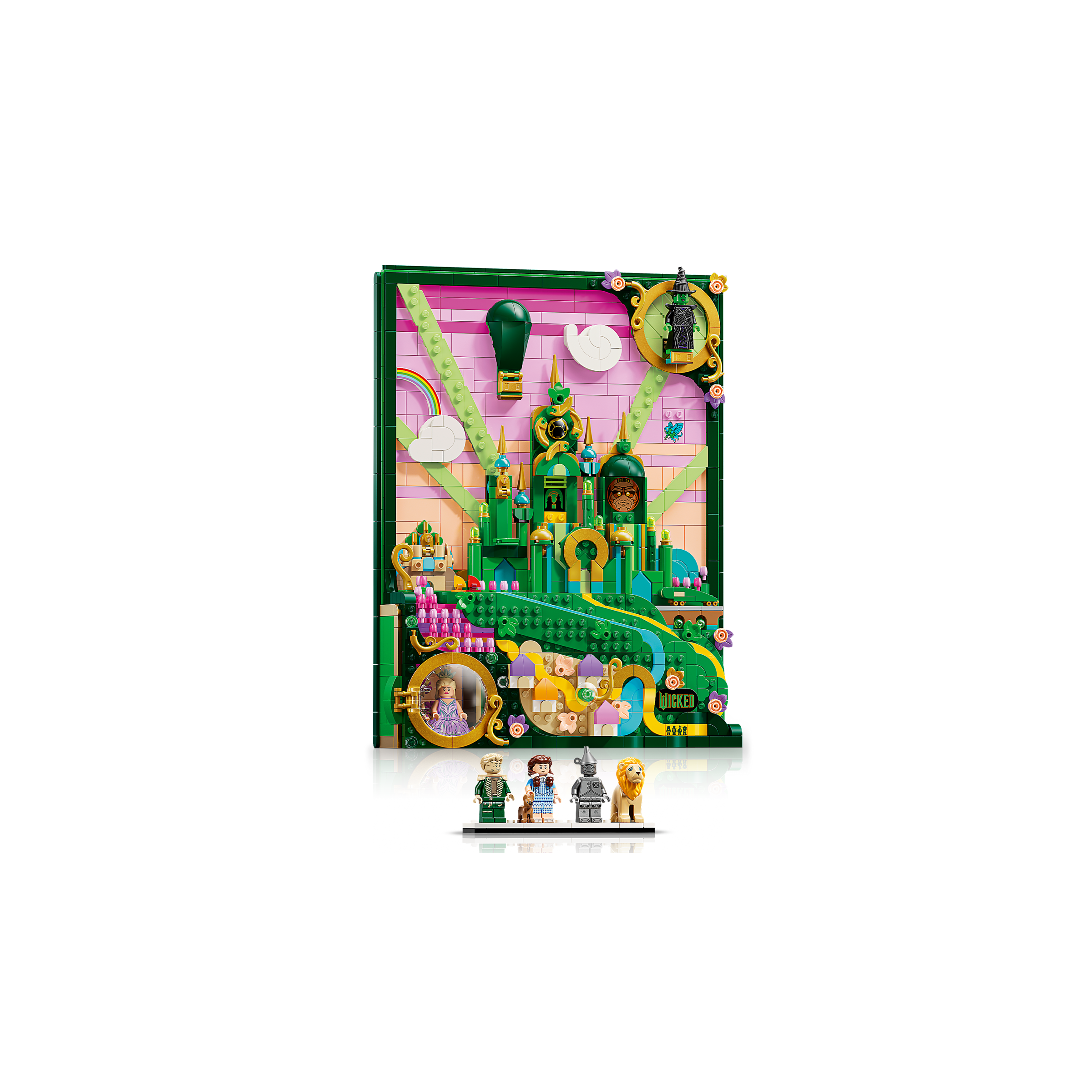 7 characters and minifigures – LEGO artwork features Elphaba flying over Emerald City and Glinda floating in her bubble, as well as Dorothy Gale, Cowardly Lion, Scarecrow, Tin Man and Toto