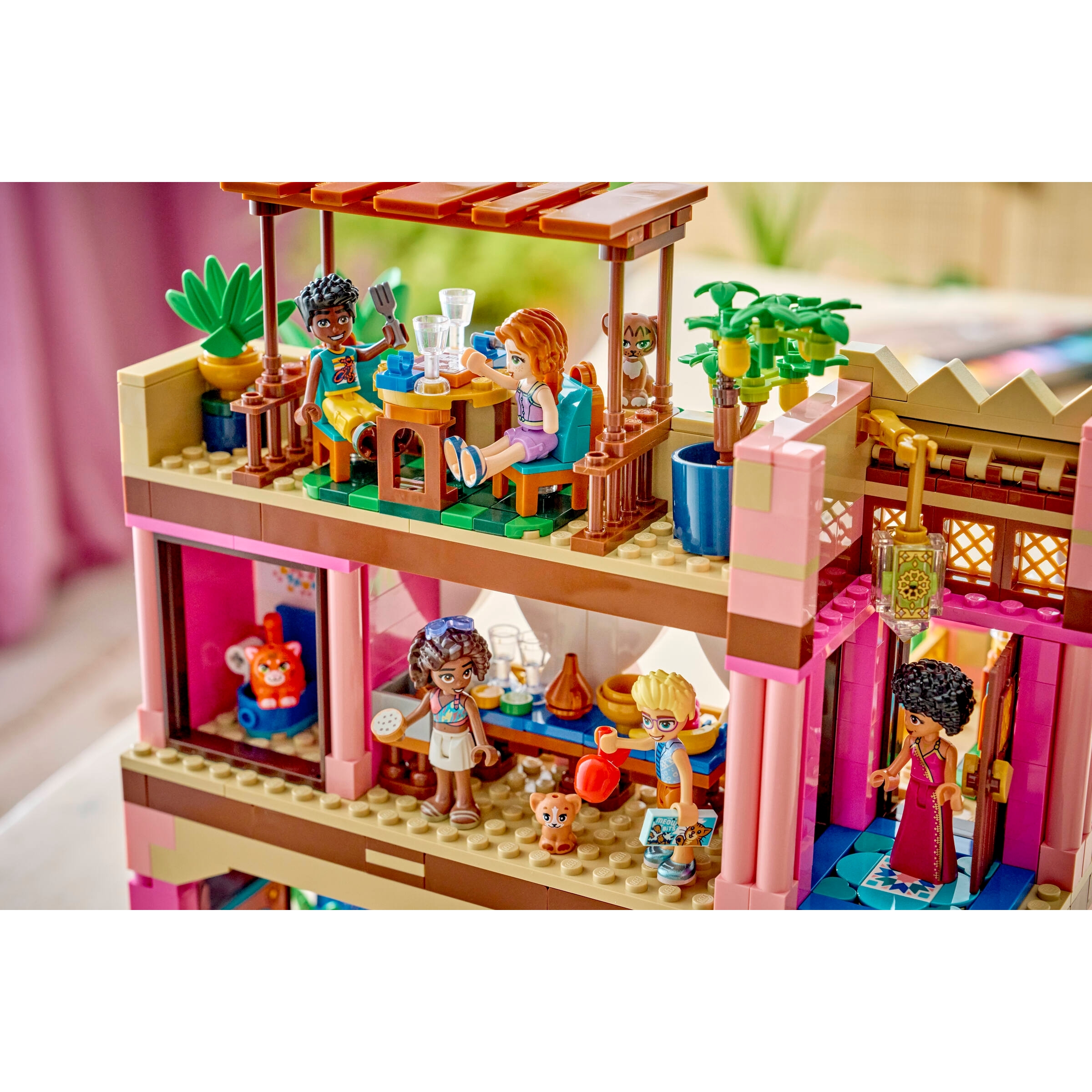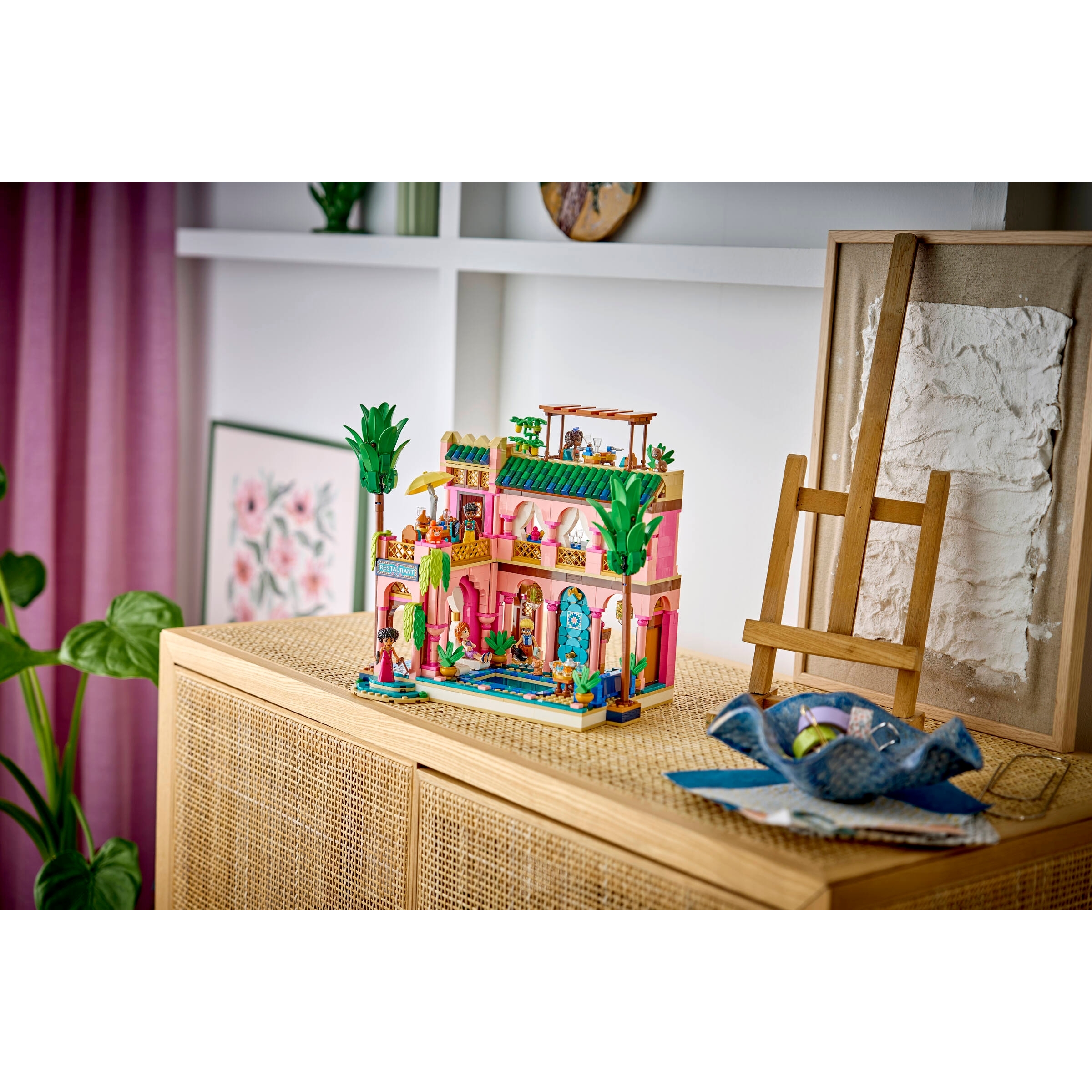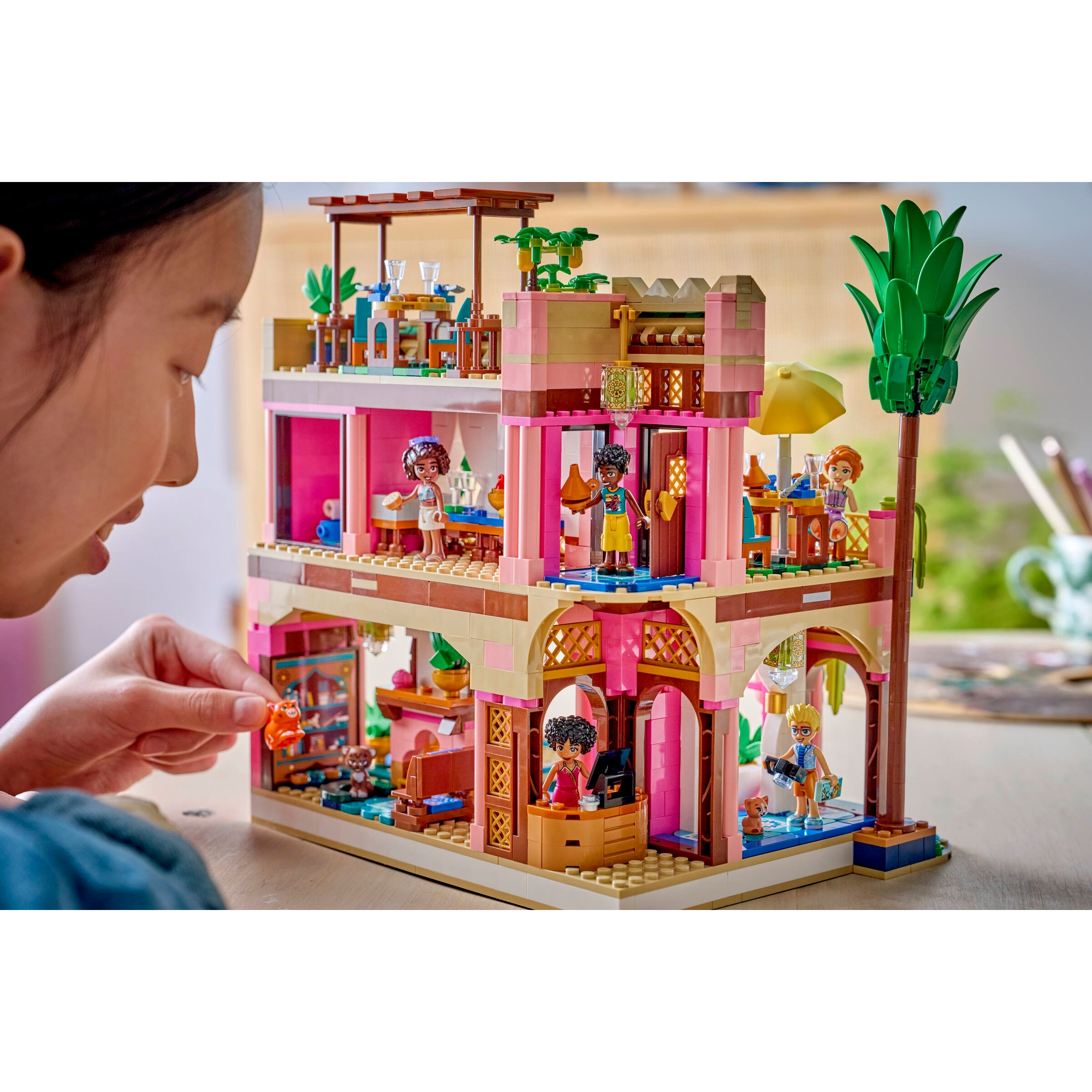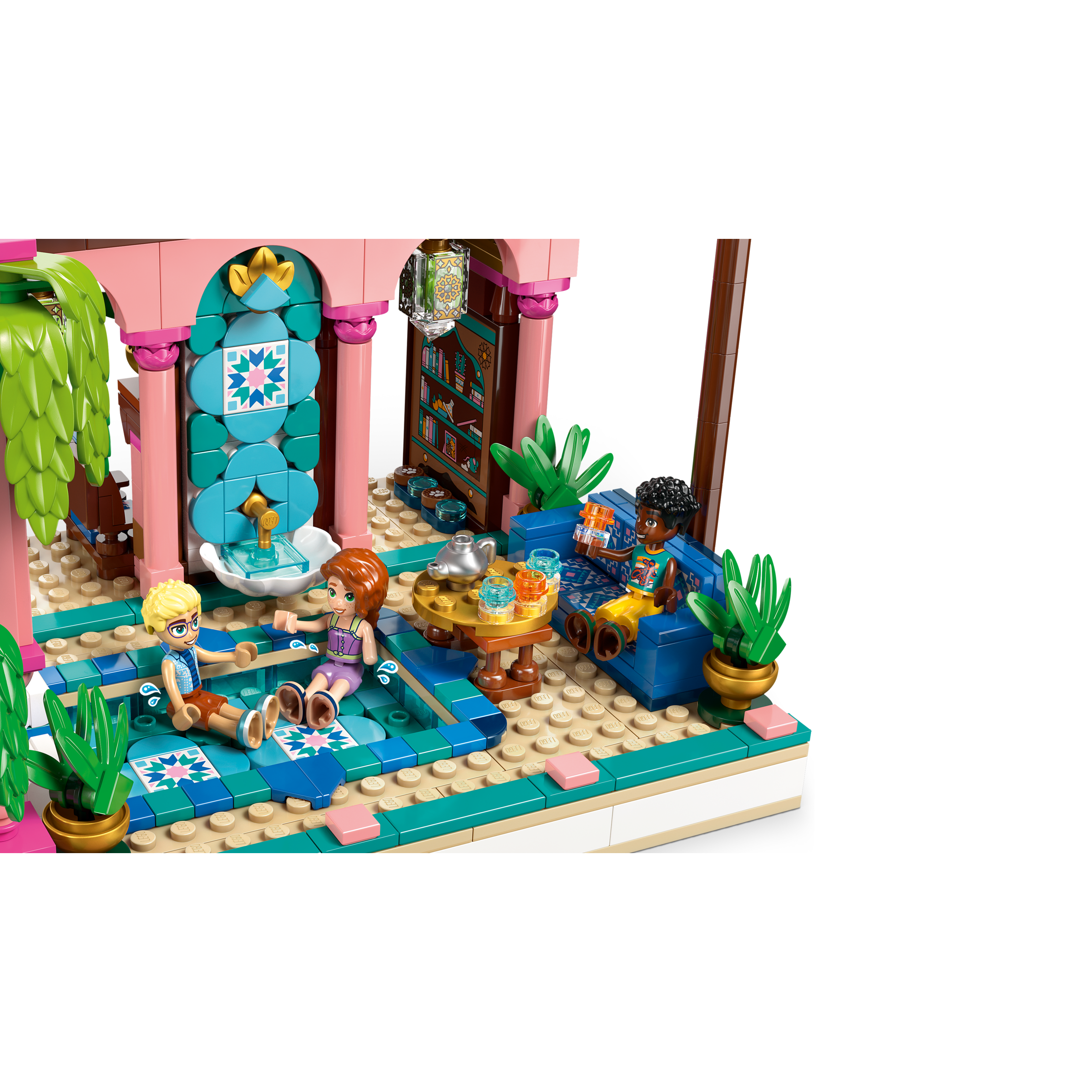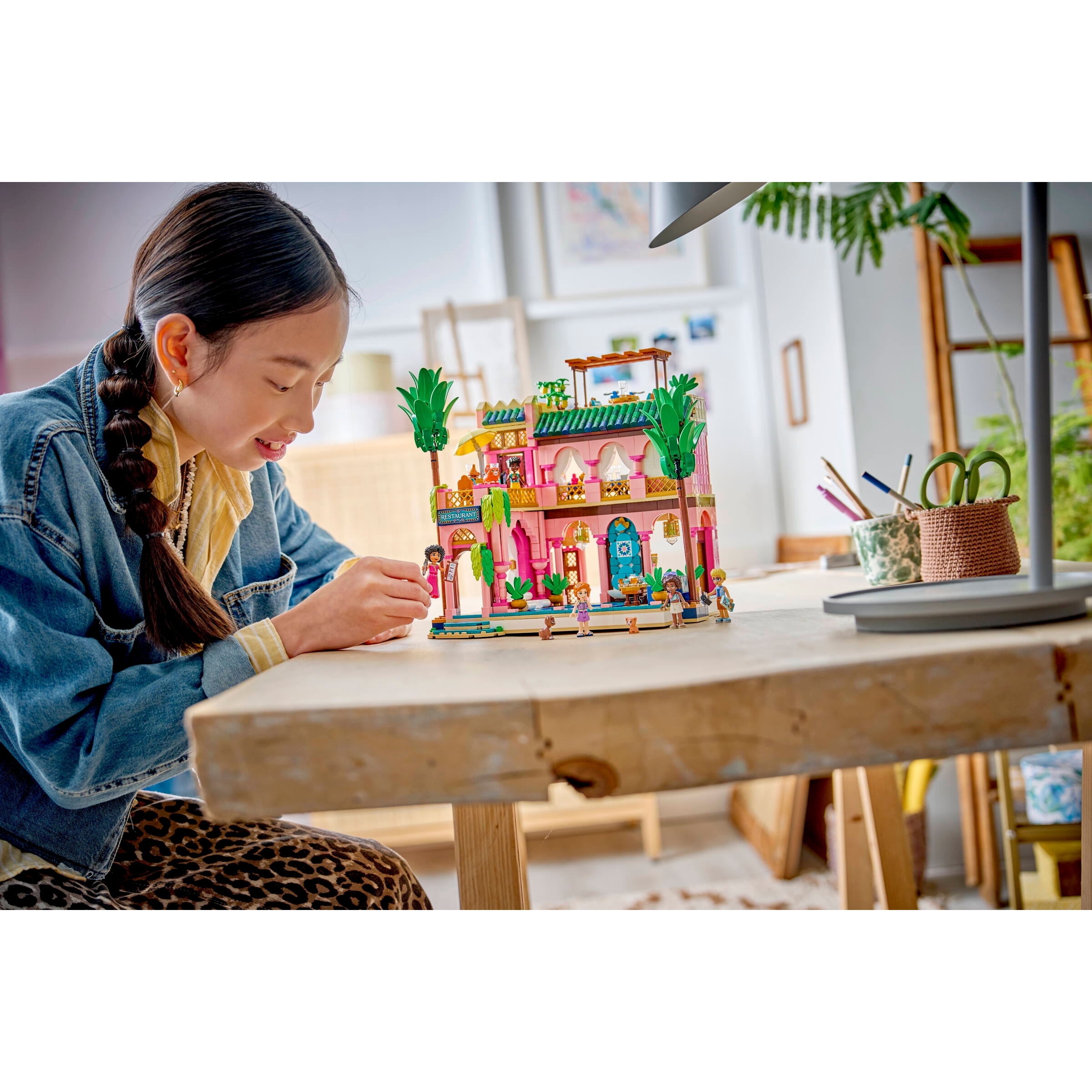 The vibrant set features lots of intricate details and colorful tile decorations. Kids can enjoy an immersive project as they assemble the restaurant’s features. Discover all the elements of a luxury eatery including a reception and dining area. There are lots of spaces for kids to create stories including the outdoor terrace and pool, plus a study.