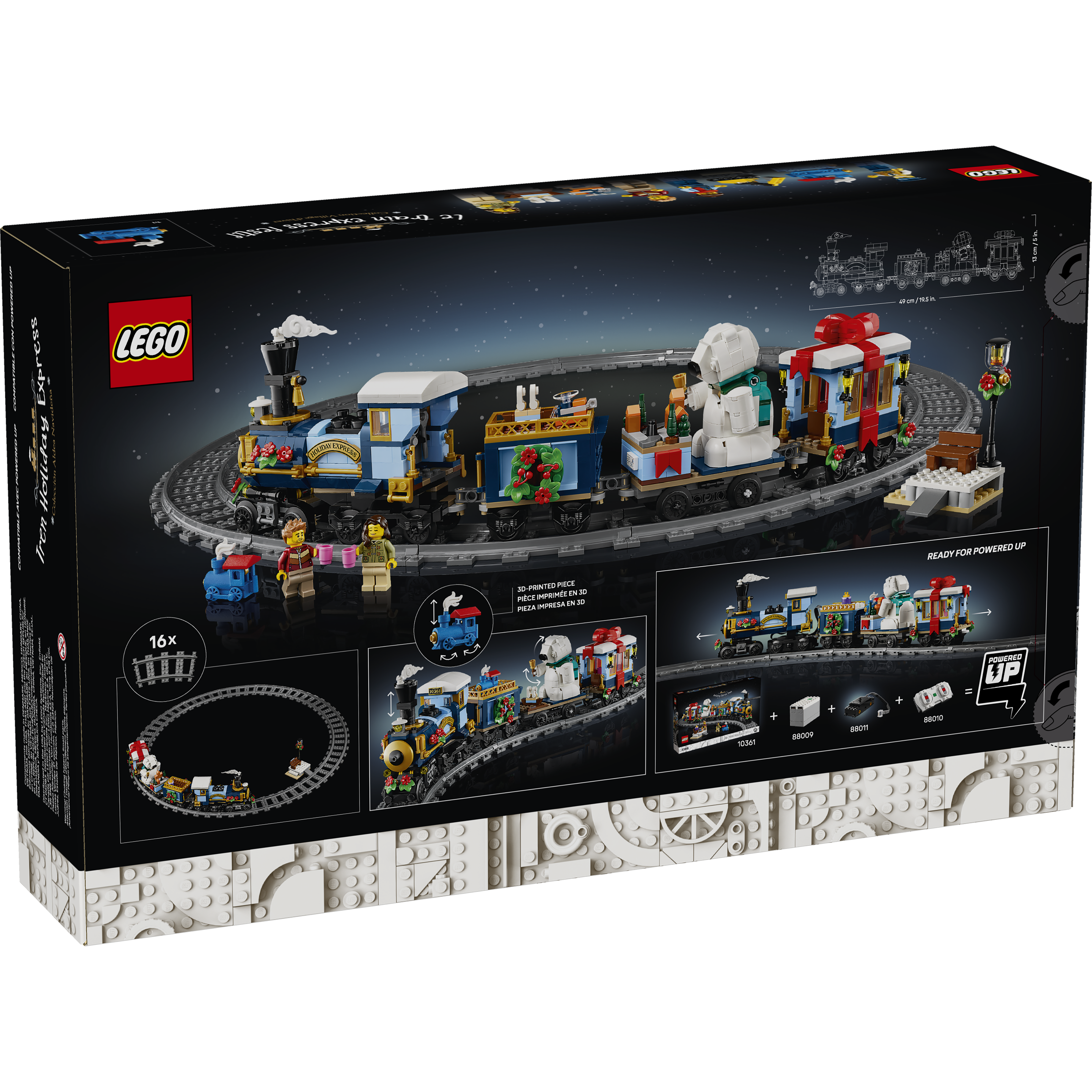 Dimensions – The 4-car Holiday Express Train in this 956-piece building set measures over 5 in. (13 cm) high, 19.5 in. (49 cm) long and 2.5 in. (7 cm) wide