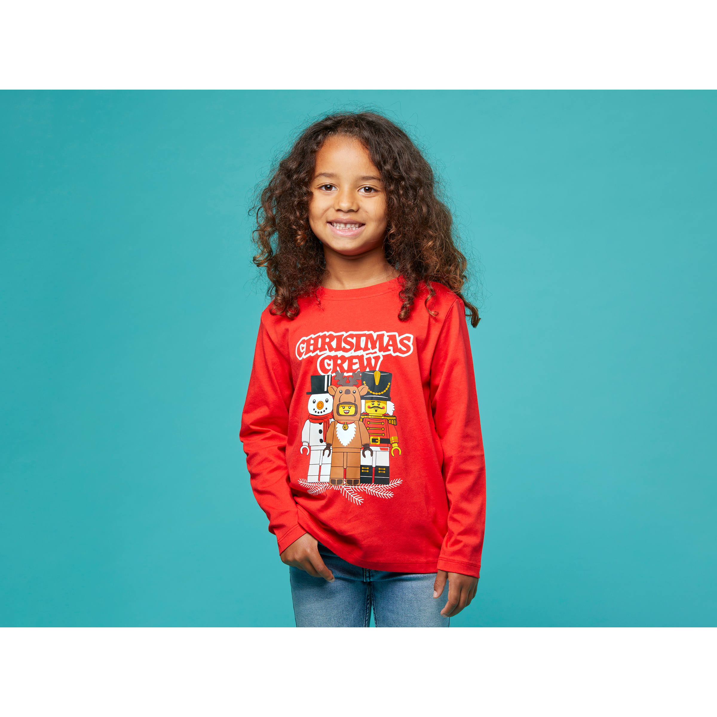 Long-sleeve kids T-shirt – The front of the T-shirt features snowman, reindeer and nutcracker soldier LEGO minifigures and the words “Christmas Crew”
