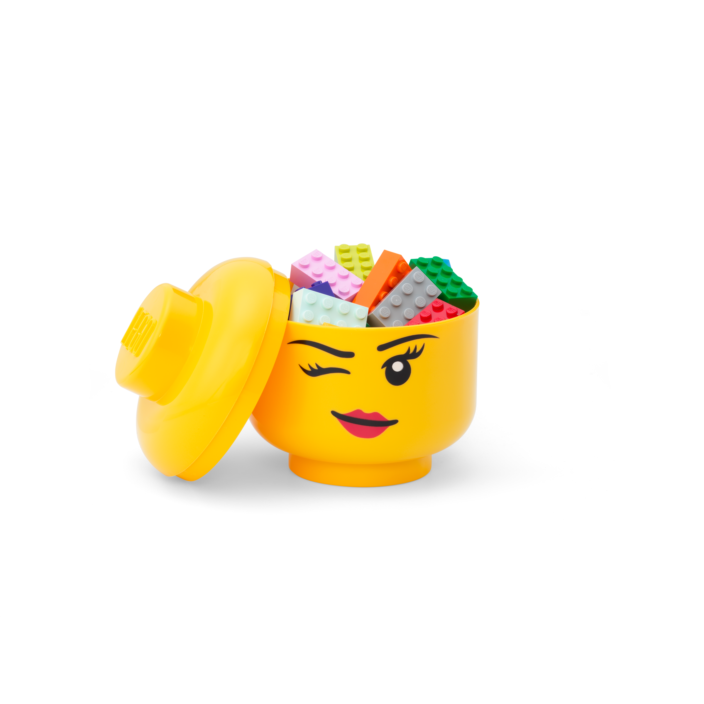 Up-scaled, stackable storage head in durable polypropylene with winking LEGO minifigure facial features.
