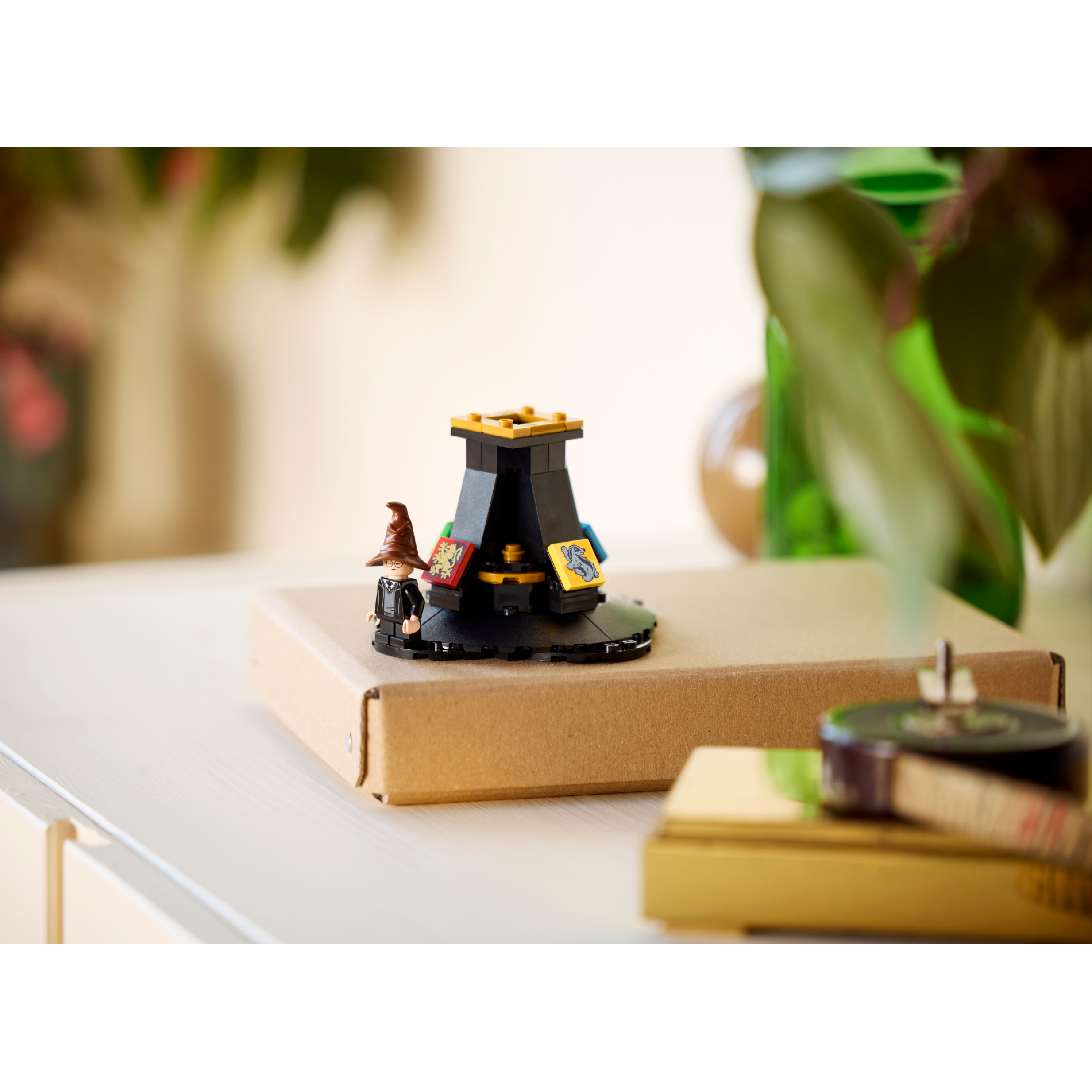 Place the hat on the stand, which features Gryffindor, Slytherin, Hufflepuff and Ravenclaw crest decorations. This unique LEGO set also includes a Harry Potter character minifigure wearing a Sorting Hat to complete a special display.