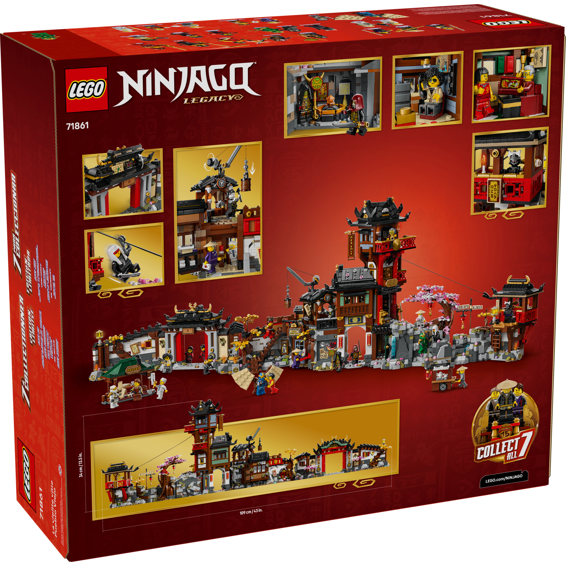 The model building kit comes with 23 minifigure characters from the TV show including all 7 of the original ninja and, for the first time, 3 collectible minifigures on a stand. Kids can build the playset using the LEGO Builder app with its easy-to-follow digital instructions. Set contains 4,851pieces.”,”featuresText”:”Boys, girls and NINJAGO superfans ages 14 and up can celebrate the history of the LEGO NINJAGO TV show with The Old Town 15th Anniversary (71861) building toy. This town playset consists of 4 modules: a front gate, post office and workshop, 3-story tower and lookout that can be connected in a circle, rearranged into a horizontal display that stretches to over 39 in. (100 cm) wide or played with separately.