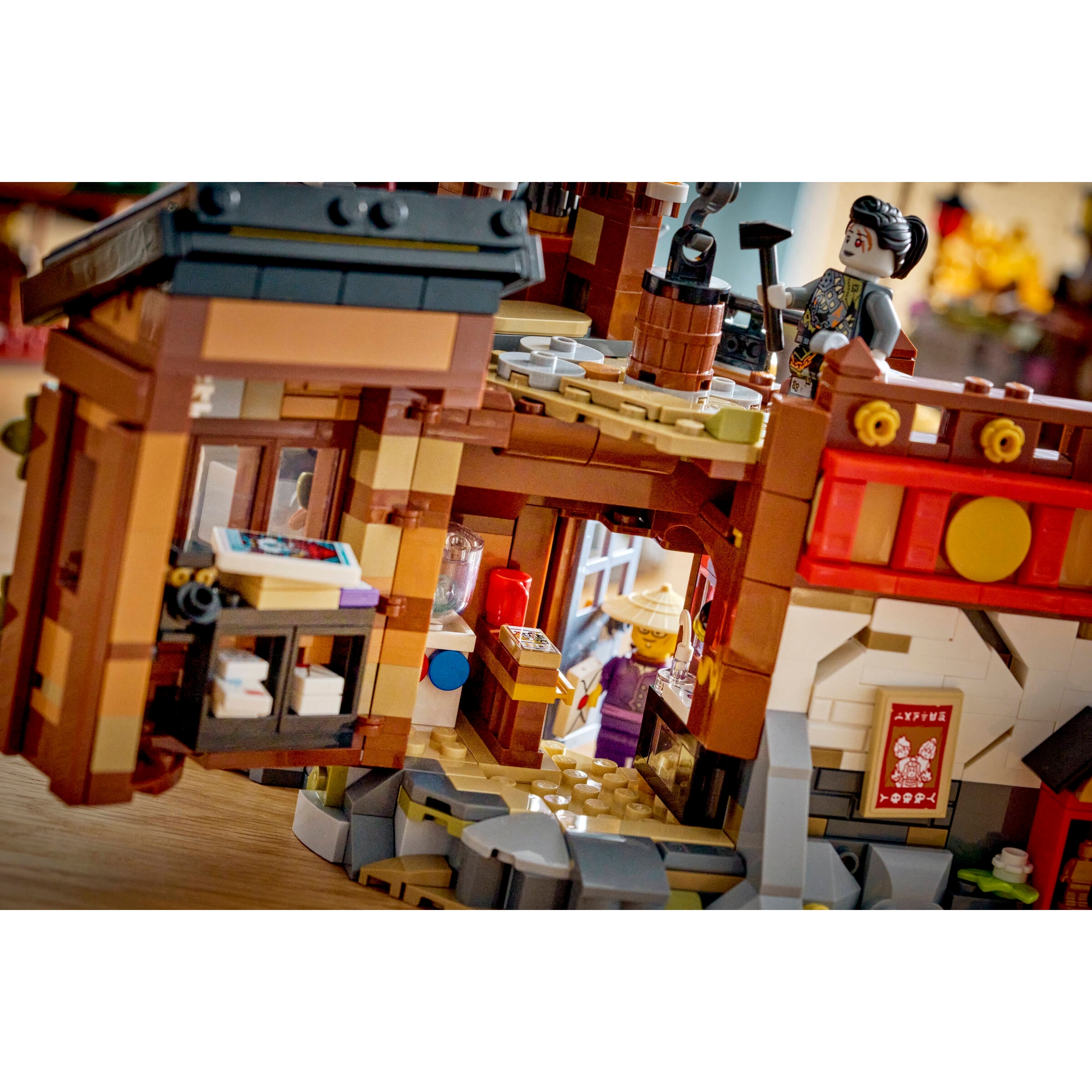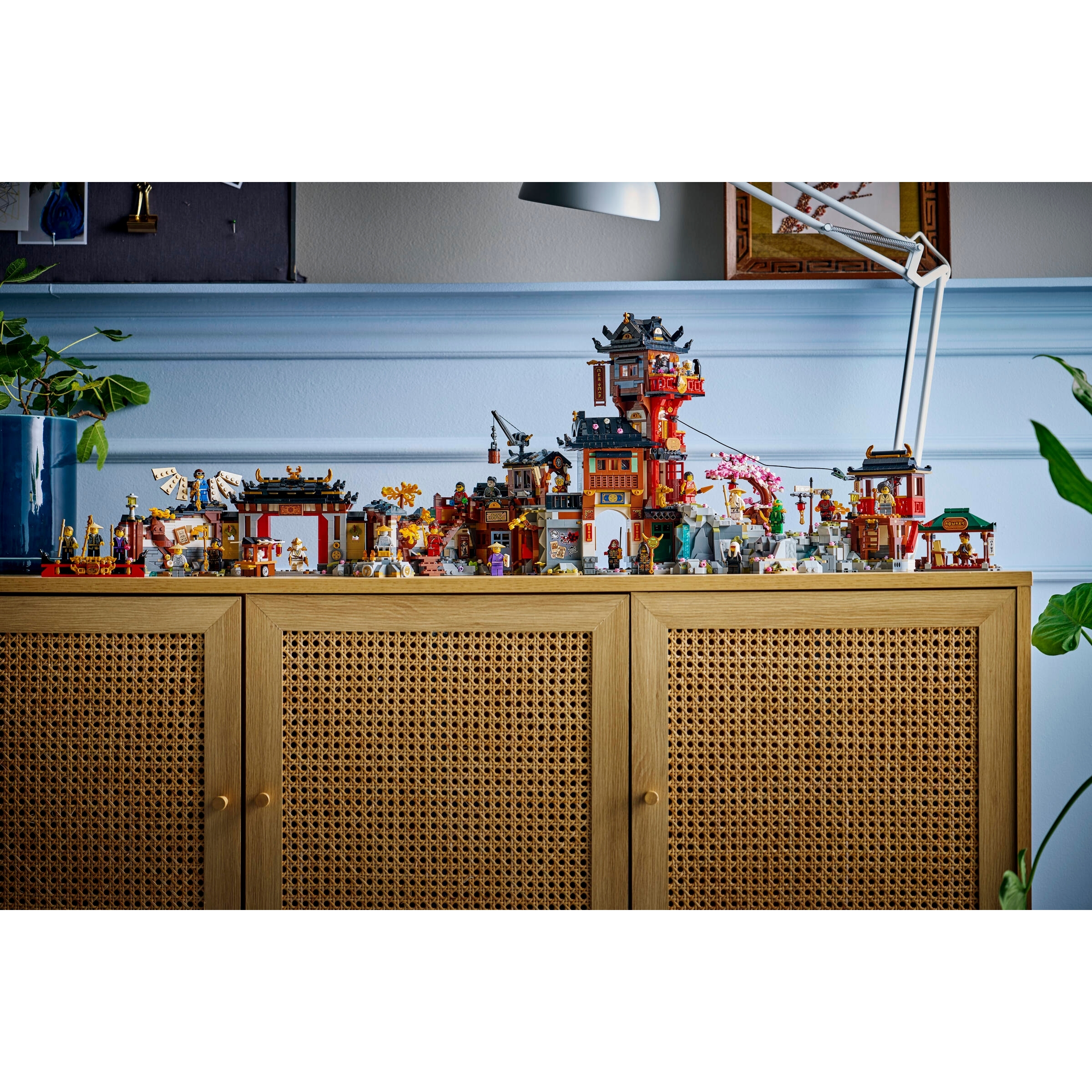 This ninja toy is packed with nostalgic references and features a zip line for minifigures to travel along, a working crane, a tea cart, a woodshop, an exploding wall and a statue of the First Spinjitzu Master, cherry blossom trees, a hidden entrance, ninja artifacts and a secret hideout.