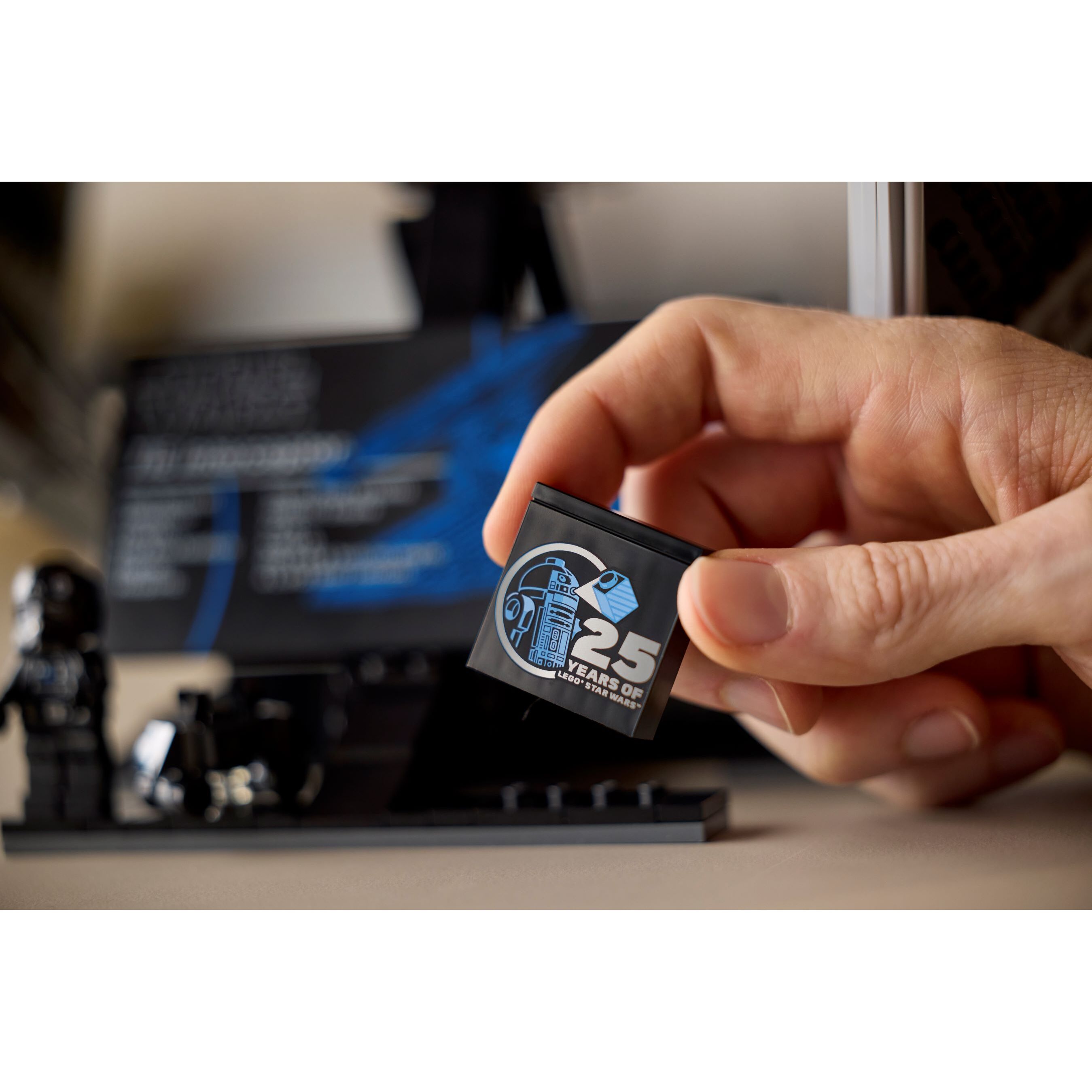 This collectible brick-built vehicle measures over 16 in. (40 cm) long and has a display stand with an information plaque, a LEGO Star Wars 25th anniversary brick and space for the included TIE Pilot LEGO minifigure and LEGO mouse droid figure.